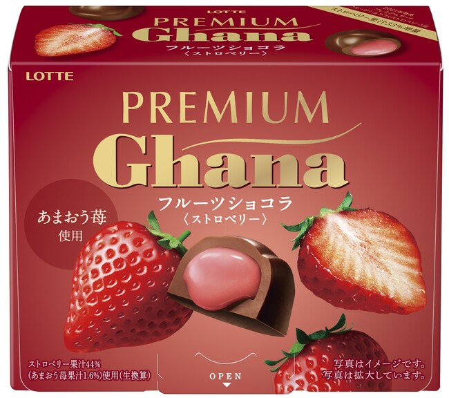 あまおう苺のみずみずしい果実感とガーナミルクの濃厚な味わいが広がる、上質なひと粒ショコラ。※ 製品中あまおう苺果汁1.6%使用(生換算)