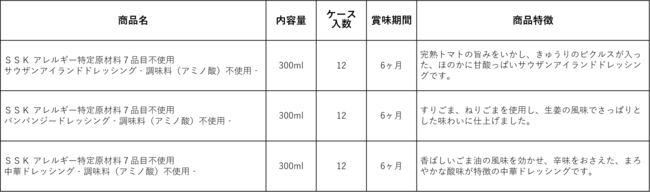「SSK アレルギー特定原材料7品目不使用シリーズ」は、2015年よりフレンチ白ドレッシング、ごまクリーミードレッシング、和風ドレッシング、ノンオイル青じそ、コールスロードレッシング、和風クリーミードレッシング、たまご・乳を使っていないシーザーサラダドレッシング(2023年2月21日発売)、たまごを使っていないマヨネーズタイプを発売し、全11商品のラインナップとなりました。主に学校給食等でご使用いただいております。食物アレルギーでお悩みの方だけでなく、みんなが同じ食卓で同じメニューを楽しむことができます。