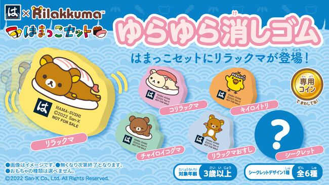 今回はリラックマとその仲間たちが、専用ガチャマシーンのおもちゃに初登場します。立てるとゆらゆらと揺れる「ゆらゆら消しゴム」は、えびやまぐろのお寿司になりきる姿や、お寿司を持っているリラックマのデザインがとても可愛らしい消しゴムです。
