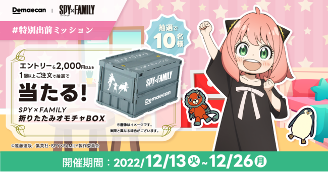 大好評の第1弾に続き、コラボキャンペーン第2弾では、「SPY×FAMILY」とコラボしたLINEスタンプの無料配信、限定書き下ろしイラストグッズがあたる『出前館』公式Twitterフォロー&RTキャンペーンを始め、「折りたたみオモチャBOX」があたるエントリー&注文キャンペーンや、『出前館』をお得に利用いただけるクーポンの配布を実施いたします。後半もキャンペーンが盛り沢山となりますので、ぜひご参加ください。なお、それぞれ実施日が異なるため、詳細はキャンペーンページをご確認ください。