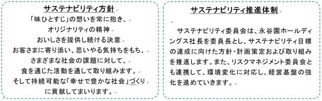 永谷園グループは、2022年12月に持続可能な社会の実現に向けた取り組みをグループ全体で強化することを目的として「永谷園グループサステナビリティ方針」の策定、サステナビリティ推進体制を構築しました。今後はサステナビリティ委員会を中心にして、社会や環境問題をはじめとするサステナビリティを巡る課題を整理し、マテリアリティ(重要課題)の特定や、TCFDに基づく情報開示を順次行ってまいります。