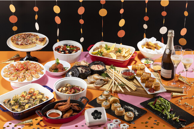 “スウィンギングロンドン”、“スウィンギング60s”と呼ばれたロンドンが活気に溢れた時代をオマージュし、オレンジとピンクのレトロポップカラーに彩られた空間で、DJによるミュージックパフォーマンスの中、シェフが手掛けるイギリス料理を含めた様々なフードやスイーツ、そして多彩なドリンクをビュッフェスタイルにてご堪能いただけます。選べるドリンクの種類が異なる、スタンダードプラン9,000円とプレミアムプラン11,000円の2種類のプランをご用意。プレミアムプランでは、生ビール、ウイスキーハイボールなどのドリンクの他、ミクソロジストが手掛けるオリジナルカクテルもお楽しみいただけます。