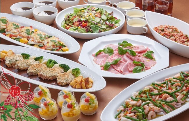 お料理は、鰊昆布巻き、黒豆、紅白なます、田作り等のおせち料理や海老・マグロ・穴子の海鮮ちらし寿司、各種肉料理、エビフライ、パスタ、フライドポテト、デザートなどお子様にも人気のメニューが約30種類バイキングでお楽しみいただけます。また、シェフが切り分けるローストビーフや、ディナーではシェフが目の前で仕上げる豚しゃぶしゃぶ等もご用意しております。