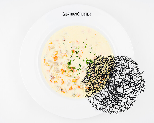 冬の寒さを和らげるクラムチャウダー。イカスミを練りこんだチュイルを添え、潮の香がより引き立つ一皿に仕上げました。