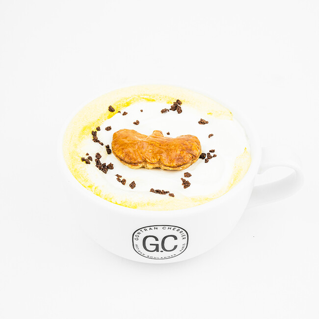 クリスマスシーズンにもピッタリな甘いパンプキンのドリンク。可愛らしいかぼちゃ型のパイをあしらい、チョコクランチのアクセントも利かせました。