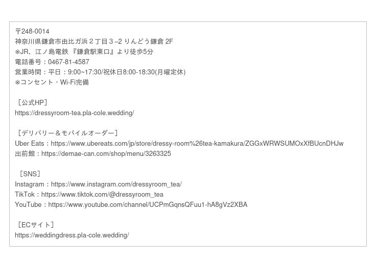 『個性が煌めく魔法の言葉』 "100人の人生に100通りに煌めく魔法をかける"をテーマに創設された古都鎌倉発のラグジュアリーブランド、PLACOLE&DRESSY(プラコレ&ドレシー)がプロデュースするカフェ&バー、『お花とドレスと紅茶のお店 DRESSY ROOM&Tea』にて、お店を丸ごと貸し切って自分達だけの時間を楽しめる貸切パーティープランを開始。こだわりの料理全7品と、ドリンクは飲み放題付きでご用意しております。2022年6月にオープンしたばかりのおしゃれなカフェを貸し切って、自分達だけの楽しい時間を過ごしてみませんか?忘年会・クリスマスパーティ・食事会・撮影会など幅広い用途でご利用いただけます。