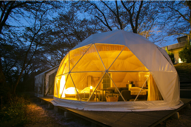 出雲空港から車でわずか10分、縁結びの聖地で知られる出雲市の「湯の川温泉」に位置する「温泉旅館四季荘」とグランピング×ホテル・旅館の新しい掛け合わせのグランピング施設を運営する「glampark」がタイアップし生まれたドーム型のグランピング施設【glampark四季荘】