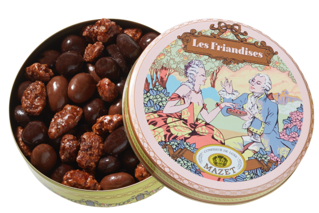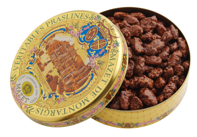 定番プラズリンを心ゆくまで堪能できる上品なプラズリン缶。品と華やかさを掛け持つ缶のパッケージデザインは、創業地モンタルジのミラボー広場に面した本店をモチーフにしています。