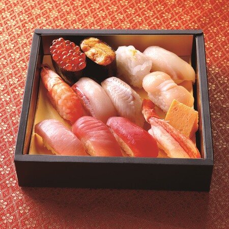 【内容】大とろ・中とろ・まぐろ赤身・生うに(胡瓜添え)・いくら・紅ずわいがに・ほたて・真鯛・寒ぶり・いか・柚子ふり穴子・切り玉子