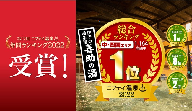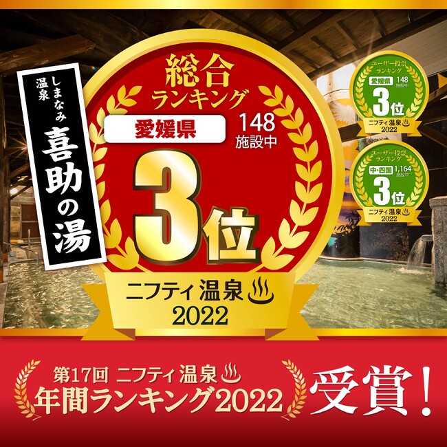 総合エンターテイメント企業・キスケ株式会社(本社:愛媛県松山市、代表:山路義則)が運営する「伊予の湯治場 喜助の湯」、「しまなみ温泉 喜助の湯」が、2022年12月14日に発表された「ニフティ温泉 年間ランキング」(ニフティライフスタイル(株)主催)において多くの賞を受賞しました。「ニフティ温泉」は全国16,211件(2022年9月時点)の施設情報を検索できる温浴業界最大手のサイトで、年間ランキングはユーザーからの投票数や施設紹介ページの閲覧件数、クチコミ評価、クーポンの利用状況といった独自の視点で集計され、発表されたものです。今回の受賞を励みに、地元のお客様はもちろん、県外からのお客様にもご満足いただける施設として精進してまいります。