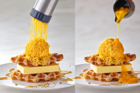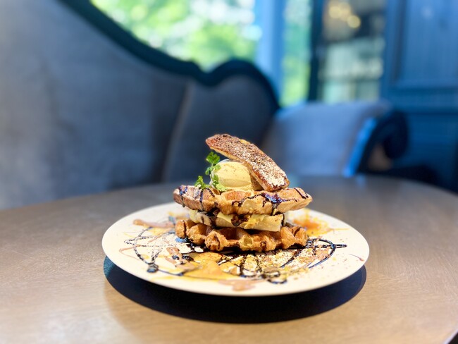 なかでも、高さが20cmほどあるアメリカンサイズの「石窯焼きブレッドバーガー」、モンブランとクロッフルの融合が斬新な「マンゴーモンブラン クロッフル」、チョコバナナを上品な大人味に昇華させた「チョコバナナ クロッフル」は、おひとりでは食べ切れないほどのボリューム感が自慢のシェフおすすめメニューです。