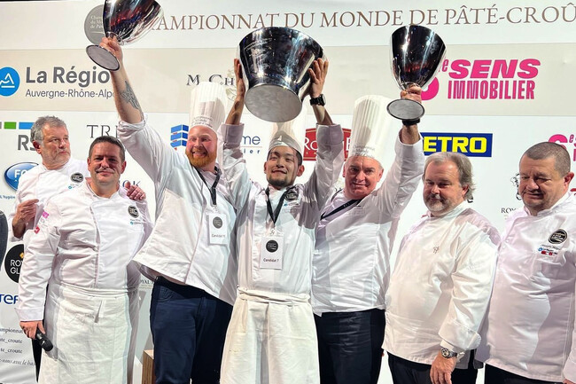 パテ・クルートは、パテをパイで包んで焼き上げるフランスの伝統料理。その完成度を競う“パテ・クルート世界選手権ファイナル”が、2022年12月5日(月)フランス・リヨンにて開催されました。これは各地の予選大会を勝ち進んだファイナリストが世界チャンピオンの座を競い合う世界大会です。審査委員長のピーエル・エルメ氏はじめ、料理界のレジェンド ベルナール・パコー氏、2021ボキューズドール優勝者デイヴィ・ティソ氏などなど、名だたるプロの審査委員が公明正大に審査にあたりました。