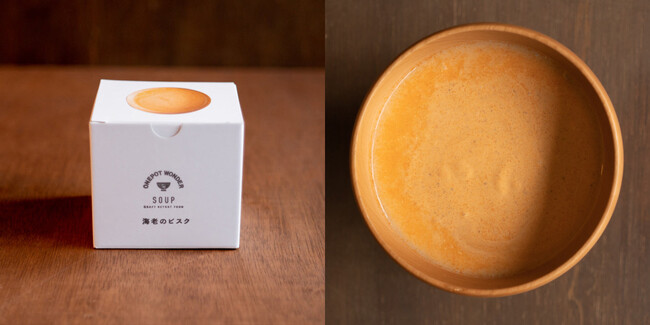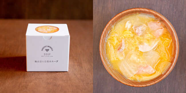 高温高圧調理で芯まで柔らかい、まるごと野菜が入ったスープや、濃厚でクリーミーな鶏白湯と白菜のスープ、海老のビスクをご用意。スープとしてはもちろん、パックご飯を入れて味わい豊かな朝粥やリゾットにアレンジするのもおすすめです。