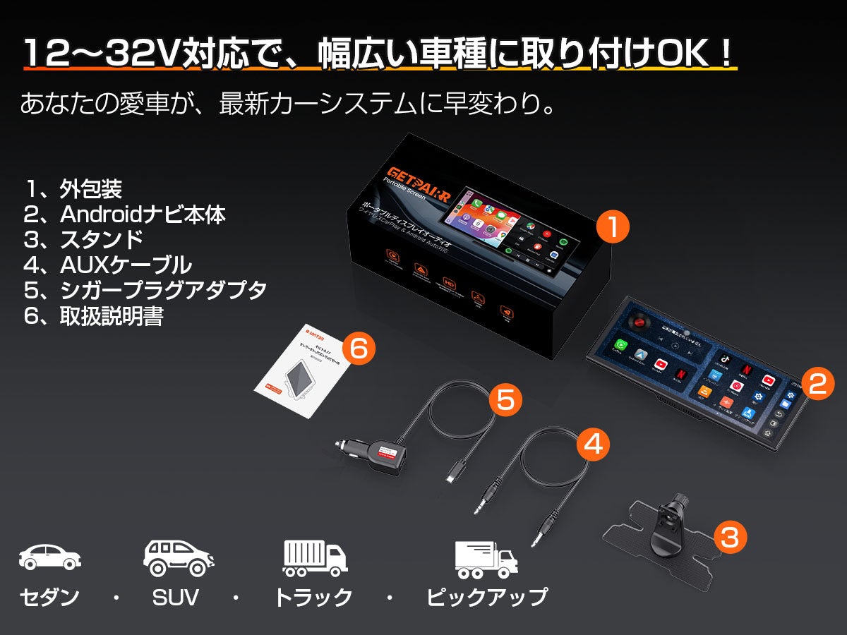12~32V対応でセダンからSUV・トラックまで幅広い車種に設置可能。電源アダプタやAUXケーブルなど付属品も揃い、届いてすぐに使い始められます。