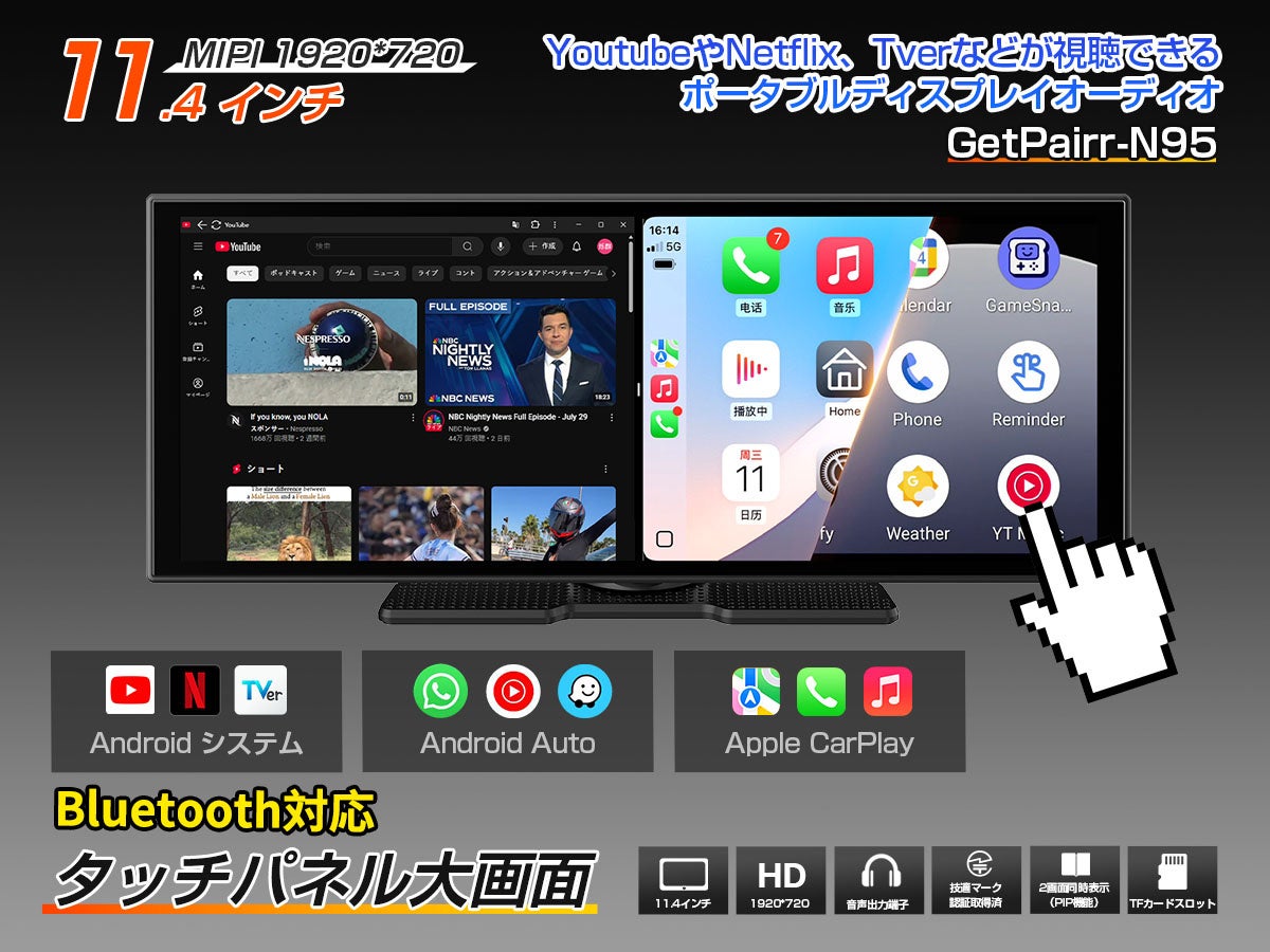 11インチの高精細MIPI 1920×720ディスプレイを搭載し、YouTubeやNetflix、ナビ画面を大きく鮮明に表示できる車載タッチパネルモデルです。