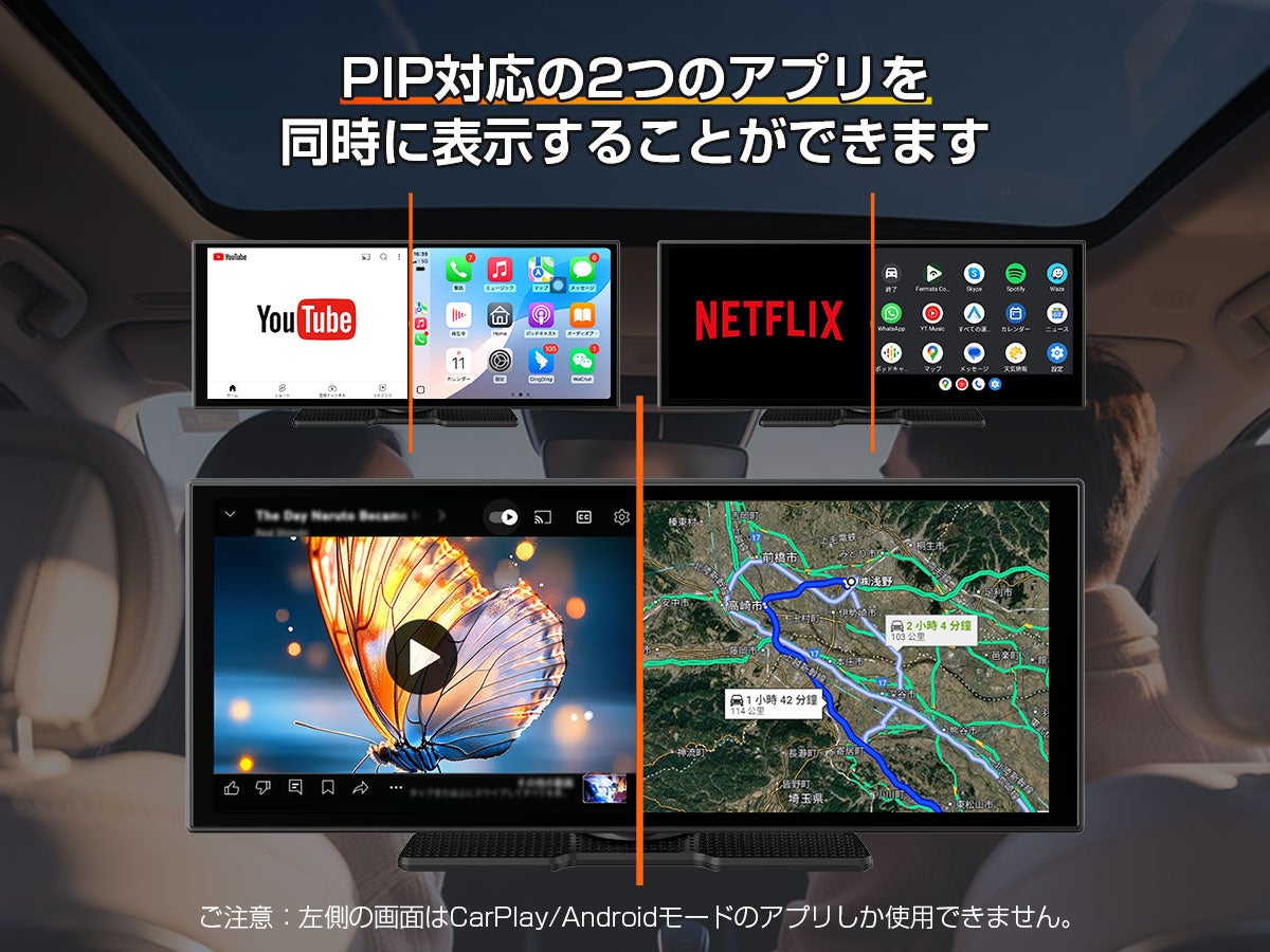 PIP機能に対応し、2つのアプリを同時に表示できます。ナビでルートを確認しながら、もう一方の画面で動画やアプリを並行して使えるため、ドライブ中の情報把握がスムーズになり、車内での利便性が大幅に向上します。