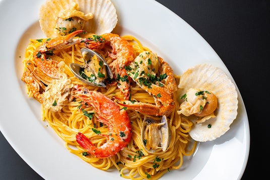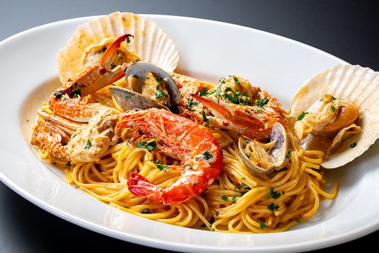 贅沢なほど海老や北海道産アサリ、大粒のホタテがゴロゴロと入ったトマトクリームソーススパゲティ