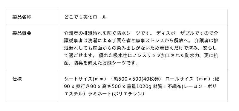 介護人口が増える状況を背景に、長く続く介護生活の中で「する側・される側」お互いが無理のない楽な介護生活を送り、 笑顔の日々が送れるよう家事ストレスからの脱却を図るシートを開発しました。 既存製品のトイレマットを応用した物になりますが、ネーミングの通りどこでも使えるシートのため介護以外でも、医療はもちろんベビーのおむつ換えや防災用品の一つとして、またペット用品として汚れが気になる場所での使用など、衛生面を配慮したシーツとして使用できます。