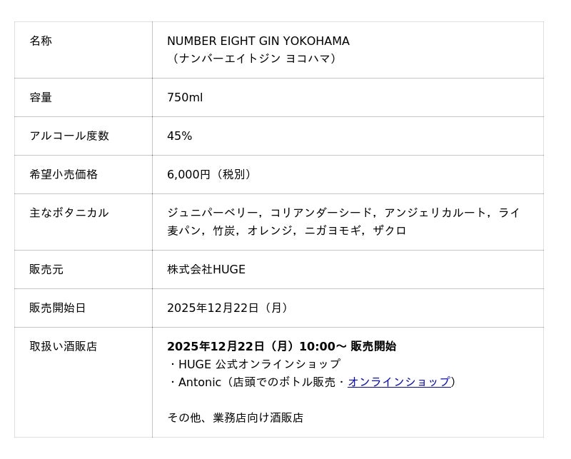 ジンの蒸溜を手掛けるハイブリッドバーテンダー「NUMBER EIGHT DISTILLERY」より深水稔大氏と、日本のバー文化を深く愛するジントニック専門店「Antonic」による、コラボレーション商品『NUMBER EIGHT GIN YOKOHAMA』を2025年12月22日(月)に発売。