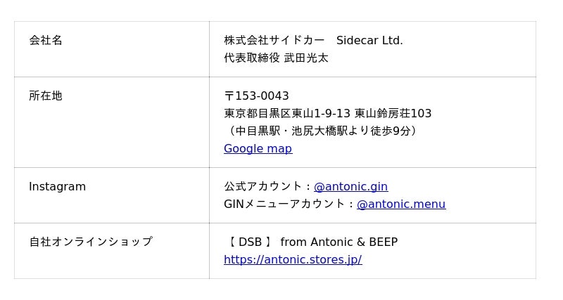 中目黒のジントニック専門店 The World Gin&Tonic〔Antonic〕(ザ ワールドジンアンドトニック アントニック)を運営する株式会社サイドカー(本社:東京都目黒区、代表取締役:武田光太)。