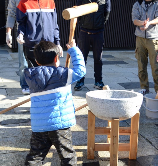 お子さま連れでも楽しめる、参加型の餅つきイベントです。