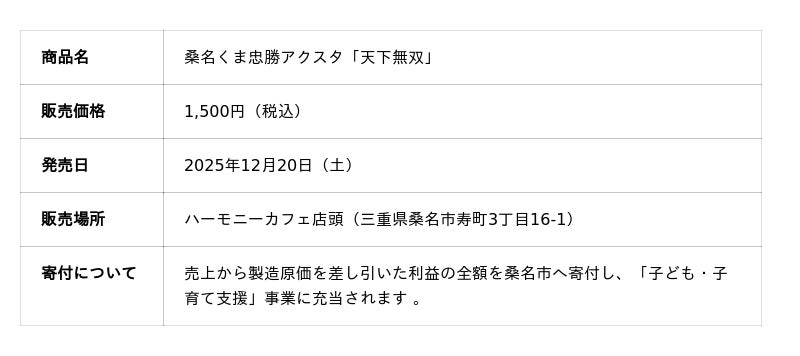 三重県桑名市の「ハーモニーカフェ」(運営:ハーモニー農園合同会社)は、人気育児ブロガー「しぃ」氏とコラボレーションし、桑名ゆかりの武将・本多忠勝をモチーフにしたアクリルスタンド『桑名くま忠勝アクスタ「天下無双」』を2025年12月20日(土)より発売します 。
