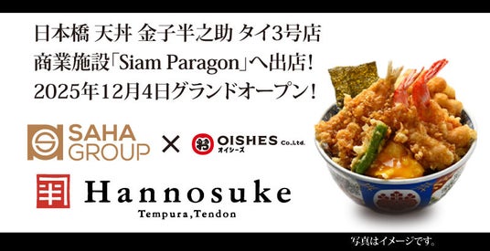 人気飲食店、つけ麺「つじ田」や「日本橋 天丼 金子半之助」「中華そば専門 田中そば店」などをグループで運営する、オイシーズ株式会社(本社:東京都 千代田区 、代表取締役 工藤 智、以下「当社」)は、タイ王国の財閥系大手企業グループの「Saha Group(サハ・グループ)」と共に、2025年12月4日(木)バンコク中心部にある巨大複合施設「Siam Paragon(サイアム・パラゴン)」内に、「日本橋 天丼 金子半之助 Siam Paragon(サイアム・パラゴン)店」をグランドオープンいたしました。「日本橋 天丼 金子半之助」は、2024年11月22日にタイ王国内1号店としてグランドオープンした「One Bangkok(ワン・バンコク)店」2025年6月2日にオープンした「KINGSQUARE(キングスクエア)店」に続き、3号店目となります。今後も当社は「Saha Group」と共に、タイ王国内にて「日本橋 天丼 金子半之助」を積極的に出店していく予定です。