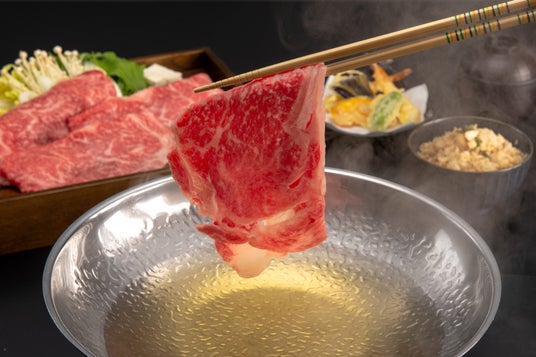 生まぐろはお造り、ステーキ、料理長特製の「まぐろパフェ」でご用意します。お造りは赤身とトロの区別がなくピンクの身が特徴のキハダ、モチモチ感が特徴で、地元の食卓では最もポピュラーなビンチョウと2つの異なるまぐろを味わうことができます。「まぐろパフェ」はまぐろとご飯をミルフィーユ状に仕立てた、見た目にも鮮やかな一品です。和歌山県外に年間170頭程しか出回らず、主に県内で消費されるため希少なブランド和牛「熊野牛」は、きめ細やかで柔らかな肉質・甘みと肉そのものの風味に優れた高級和牛です。とろけるような柔らかさと甘味が口の中に広がる和牛を、冬ならではのしゃぶしゃぶでお召し上がりください。