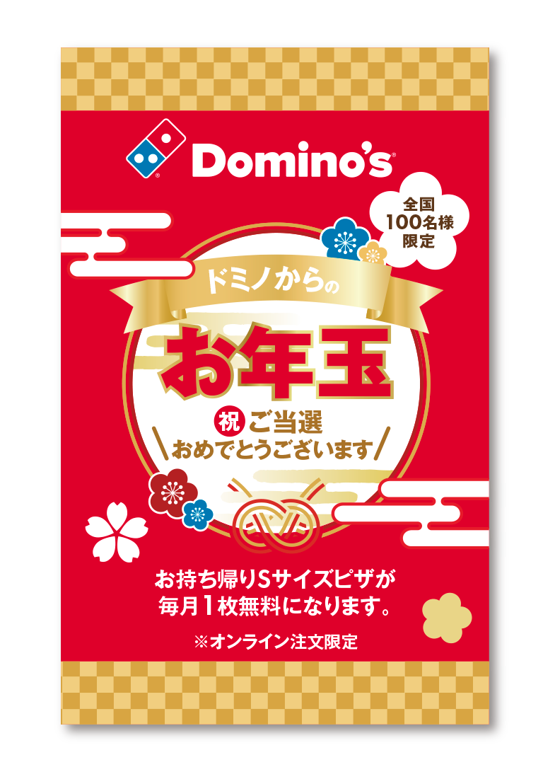 「ドミノのお正月セット」をご購入いただいたお客様の中から、全国でランダムに選ばれた100名様に、“ピザ1年分無料クーポン”としてご利用いただける「ドミノからのお年玉」をプレゼントいたします。“ピザ1年分無料クーポン”はお持ち帰り限定で、お好きなSサイズピザが毎月1枚まで無料となる、ピザ好きにはたまらないクーポンです。「ドミノからのお年玉」は、商品受け渡し時にランダムでお渡しする仕組みなので、ピザを注文して届くまでのワクワク感が、さらにアップすること間違いなし!ぜひ、「ドミノのお正月セット」をご注文いただき、新年の運試しとしてお楽しみください!