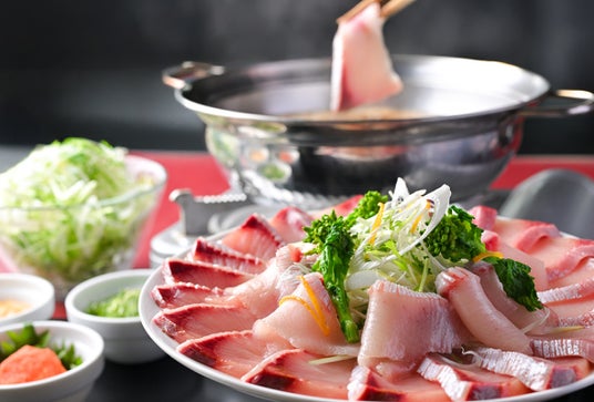 冬の味覚の代表格である寒ブリの身を使用。お鍋には淡路産玉ねぎスライスと菜の花を浮かべており、ブリで巻いてお召し上がりください。その他に具材として絹豆腐・水菜もご用意しております。