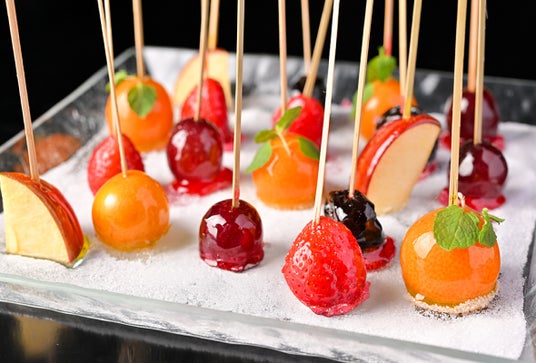 りんご飴をはじめとした、いちご・ぶどう・みかんといったフルーツ飴を、お好みでシナモンシュガー・サイダー・ミルクなどのフレーバーパウダーをまぶしてお召し上がりいただけます。縁日でおなじみの昔懐かしい「屋台の甘味」で、お正月のお祭り気分を味わってください。