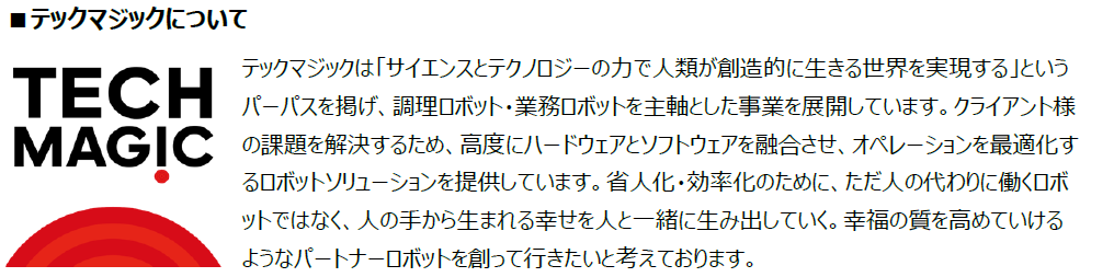 テックマジックは、2018年2月に設立。「サイエンスとテクノロジーの力で人類が創造的に生きる世界を実現する」をパーパスに掲げ、食を取り巻く多くの企業が直面する人手不足を解消し、人がより付加価値の高い業務に従事し、生産性の高い社会を実現するために、最新のAIやロボット技術を高度に融合した各種プロダクトの企画、設計、販売、保守を行っています。