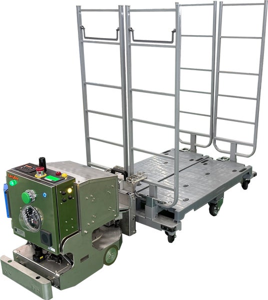 従来、人力で行っていた-25℃環境下の重量台車を牽引する作業をAGV6台で自動化します。