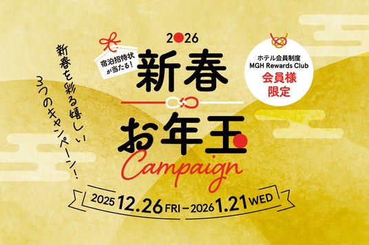 株式会社三井不動産ホテルマネジメント(本社:東京都中央区、代表取締役社長:杉山亮)は、三井不動産グループの国内外40ホテルを対象とした会員プログラム「MGH Rewards Club」の会員様を対象にした「2026新春お年玉キャンペーン」を2025年12月26日(金)~2026年1月21日(水)までの期間限定で開催します。期間中は、3つの特別なキャンペーンを通じて、日頃のご愛顧への感謝を込め、心に残る“旅”の贈り物をお届けします。