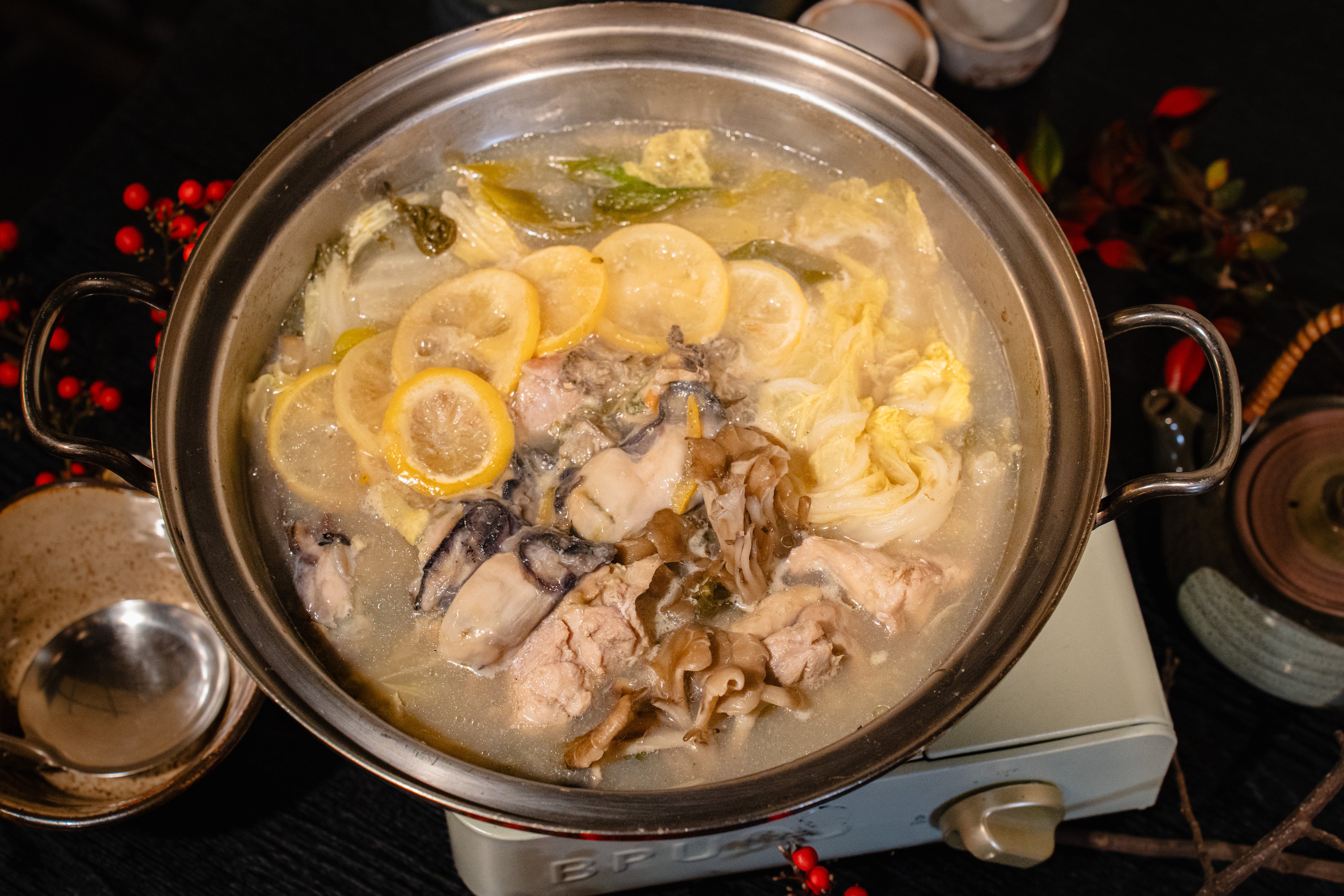 ゆず香る牡蠣の山椒鍋・・・女性人気No,1 旬の牡蠣を使用しレモンやハーブをいれた牡蠣のアロマ鍋