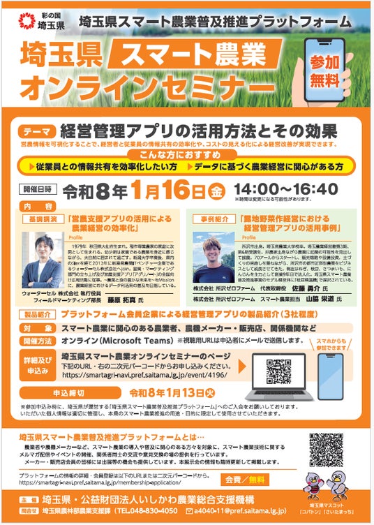 以下のURL(埼玉県スマート農業オンラインセミナー)からお申込みください。