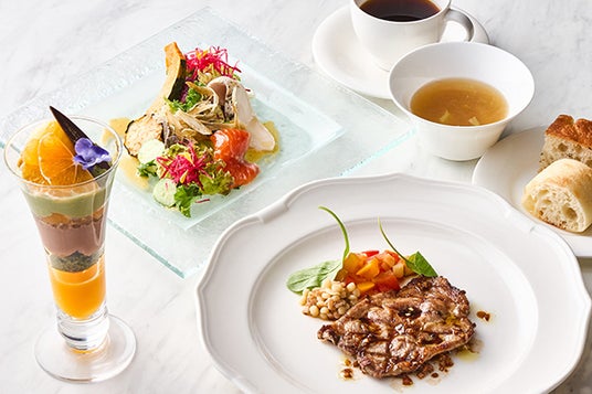 ケールや低カリウムレタスなどの野菜やハーブを使った体に良いサラダに、スモークチキンとサーモンを合わせて食べ応えがあるプレートに仕上げました。メインは5種類の中からその時の気分でお好きなものをお選びいただけ、魚また肉料理の場合、プラス¥600でパスタの追加も可能です。自分好みに量も調整いただけるランチメニューの締めくくりは、爽やかな和柑橘の風味と抹茶の旨みとほろ苦さが絶妙な、パティシエ特製パフェをご賞味ください。