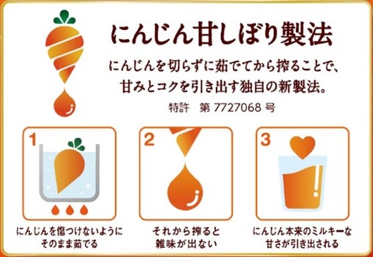 にんじんは、傷つけられると防御反応を起こし、雑味や青臭さが発生しやすい野菜です。今回の新製法のポイントは、できる限りにんじんを傷つけないことで、この防御反応を起こさせないこと。傷つける前にゆでることで、青臭さやえぐみの発生を抑え、にんじん本来の甘みを最大限に引き出しました。カゴメが約5年かけて開発した独自の新製法「にんじん甘しぼり製法」による、特別な味わいをぜひお楽しみください。