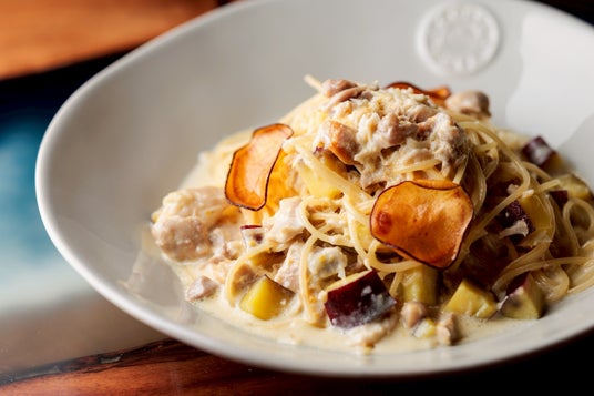 さつま純然鶏のラグーとさつまいものクリームソースパスタ