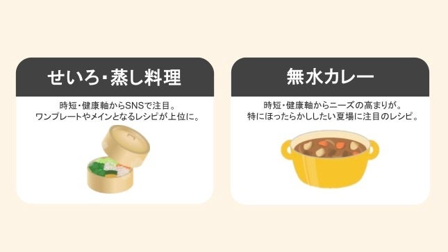 また、「無水カレー」も1.4倍の伸長率を記録。これも「時短・健康」への意識の高まりから注目されたトレンドです。特にほったらかしで調理が完了する点が評価され、手間を省きたい方や夏場にキッチンに立つ時間を短縮したい方からの関心を集めました。