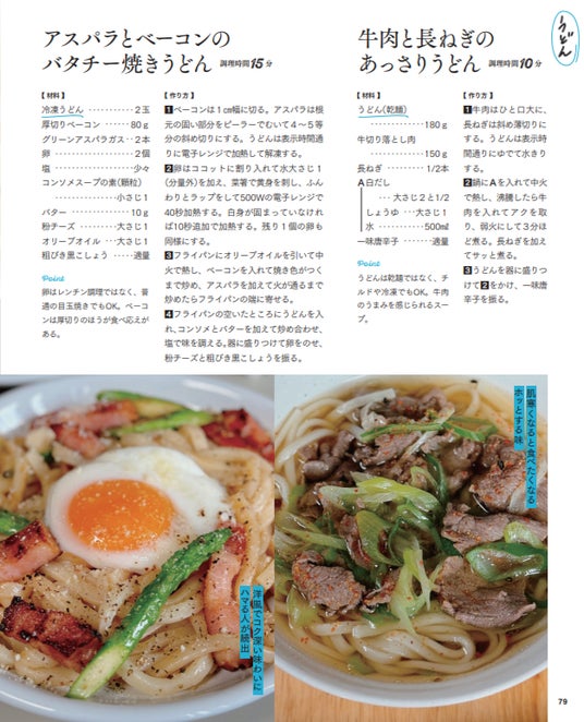 最後のパートでは、お酒の〆や休日のランチにもぴったりな麺&ご飯レシピを紹介。うどん、中華麺、ご飯などを使って、いつもの味をちょっぴりアレンジして新鮮に楽しむメニューを多数掲載しています。調理時間10分の簡単レシピや、タイ料理の定番パッタイ風焼きうどんなど、バリエーションも豊富です。