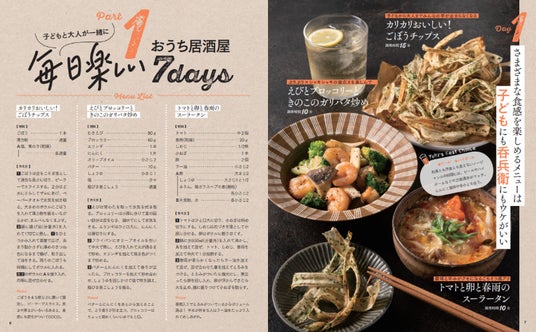 最初のパートでは、子どもから大人まで一緒に楽しめる、毎日の献立のヒントになる「おうち居酒屋メニュー」を紹介しています。中華、和食、バル風など、ジャンルにとらわれないさまざまな料理の組み合わせを提案。その日の気分やお好みに合わせて選べます。