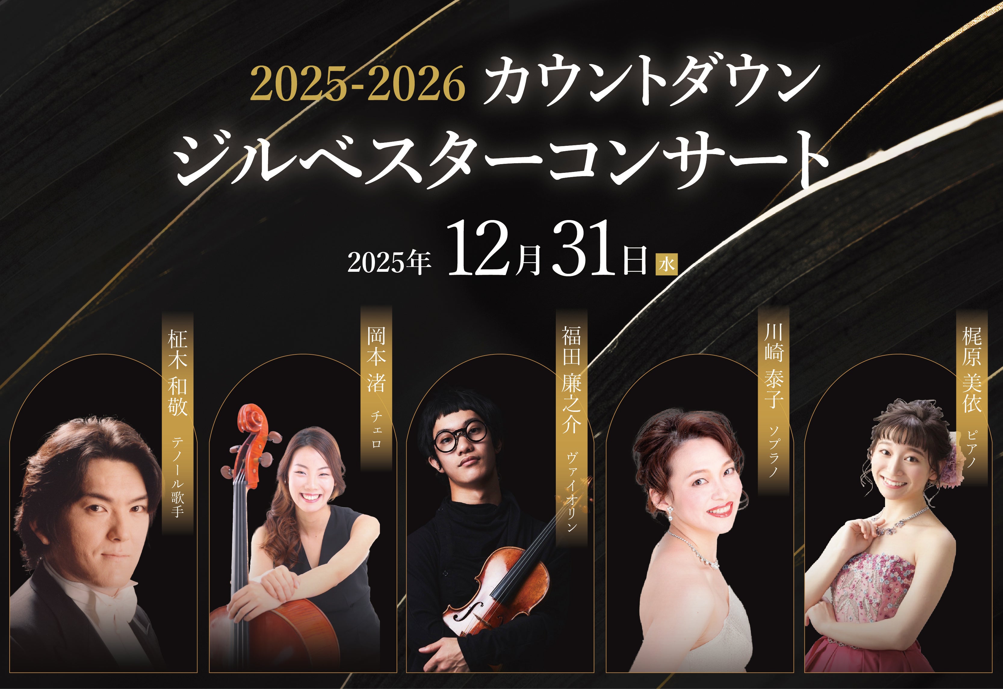 【出演者】ヴァイオリン 福田 廉之介、ピアノ 梶原 美依、チェロ 岡本 渚、ソプラノ 川崎 泰子、テノール 柾木 和敬