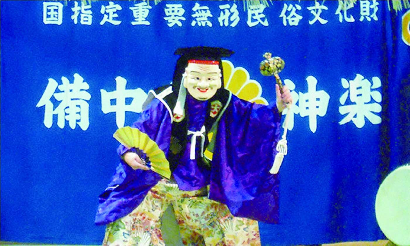 備中神楽は備中地方に伝わる神楽。荒神様を招き、その前で演じることから荒神神楽とも呼ばれ、家や農耕などに使用する牛馬の守り神として祭られてきました。荒神様の魂を安らげ、五穀豊穣と家内安全を祈り、お正月に豪快に舞います。