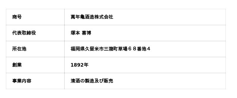 萬年亀酒造は、1892年(明治25年)の創業以来、130年以上にわたり福岡県久留米市で地域に根差した清酒製造を行ってきた歴史ある酒蔵です。その長い歴史の中で、2016年の熊本地震では蔵が壊滅的な打撃を受けるなど、幾多の困難に直面してきました。近年は後継者不在という課題も抱え、廃業の危機にあった同じ福岡県内の歴史ある日本酒酒蔵を、国益として未来に繋ぐことを第一の目的としております。そして、当社が現在取得している「その他の醸造酒免許」に加えて、新たな価値創造に向けた生産基盤を確保し、新たに福岡県発の新規酒蔵として日本酒文化の保存と発展に貢献してまいります。