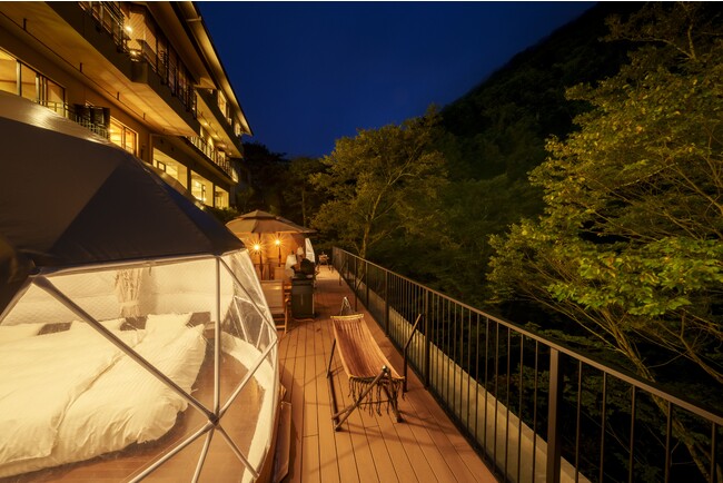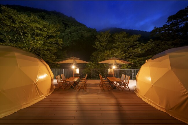有限会社山田館(所在地:長野県上高井郡高山村、代表取締役社長:高坂和弘)が運営する、230年の歴史を有する温泉旅館、松川渓谷に佇む宿 山田温泉 山田館(以下当館)は、2023年4月に「山田館グランピング」をオープンしました。松川渓谷に面した眺めの良いウッドデッキに、1日1組限定のドーム型テント2棟を設置。併設する旅館のラウンジや、天然温泉の露天風呂、内湯、隣接する大湯を自由に利用できます。源泉かけ流しの温泉、豊かな自然環境の地の利を活かし、温泉旅行だけではない、体験として新たな滞在スタイルを提案いたします。お食事は豊かな自然が広がる長野の四季の食材や、ブランド牛など贅沢に使用した老舗旅館ならではの細やかなおもてなし料理をバーベキュースタイルで提供。世界第3位にも選ばれた満天の星空の下でグランピングを楽しみ、四季の渓谷美や源泉かけ流しの湯浴みに癒される、ここでしかできないとっておきの癒し・食・滞在を体験・提供します。