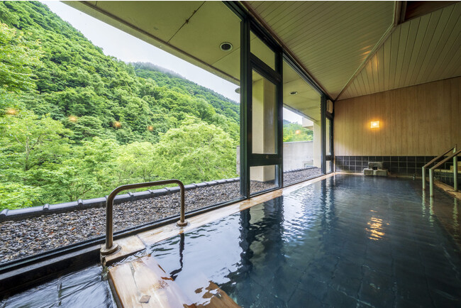 長い年月、変わることなく湧き出る山田の湯。透き通ったお湯に松川渓谷の山々が姿を映す、洋画家・和田三造ゆかりの大浴場や露天風呂で、源泉かけ流しの湯をじっくり満喫できます。(写真上から大浴場、露天風呂)