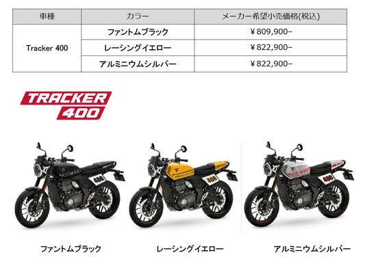 - 「Thruxton 400」「Tracker 400」はともに、本日より予約注文受付開始、販売開始は2026年3月予定