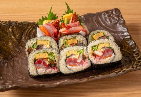 太巻きには12種類以上の具材を惜しみなく使い、断面の迫力と味の一体感を追求しました。まぐろ、白身、穴子、えび、玉子焼き、きゅうり、野菜など、多彩な素材が何層にも重なり、どこを食べても違う美味しさが広がります。にほんいち本町店を象徴する一本です。