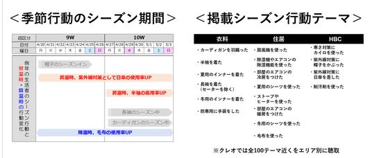 また、独自データに基づく生活者のアイテム利用行動について、例年の行動開始・終了時期を明示。さらに気温の変動がその行動タイミングに与える時期のズレを可視化しました。「今年は例年より暑くなる」なら半袖の着用前倒し、「例年よりも寒いまま」なら毛布の使用継続など、気温変化に伴うシーズンイン・アウトなどシーズニングを検討しやすくなっています。